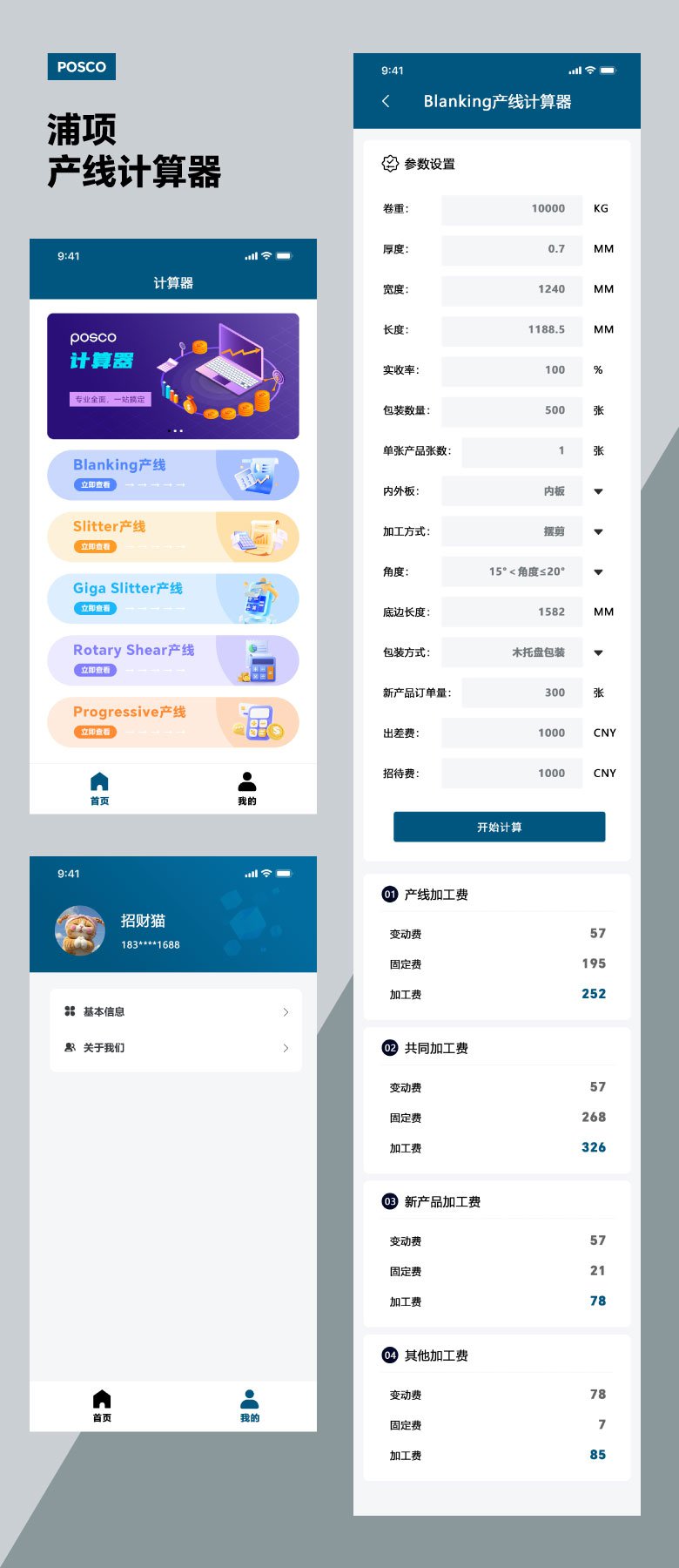 浦项微信小程序的加工费计算功能围绕“产线差异化+参数化计算”设计,核心特点如下: